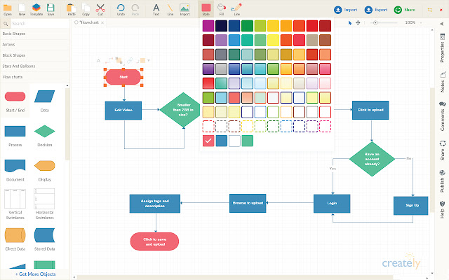 Creately es otro servicio para crear diagramas y mapas conceptuales online. El sitio requiere registro y la versión gratuita tiene algunas limitaciones, puede dibujar un máximo de cinco diagramas. Los elementos se pueden colocar de la manera que desees y personalizar eligiendo el tamaño, el color y la fuente. Una vez que el diagrama está completo, puedes exportarlo como una imagen a tu ordenador o compartirlo online.