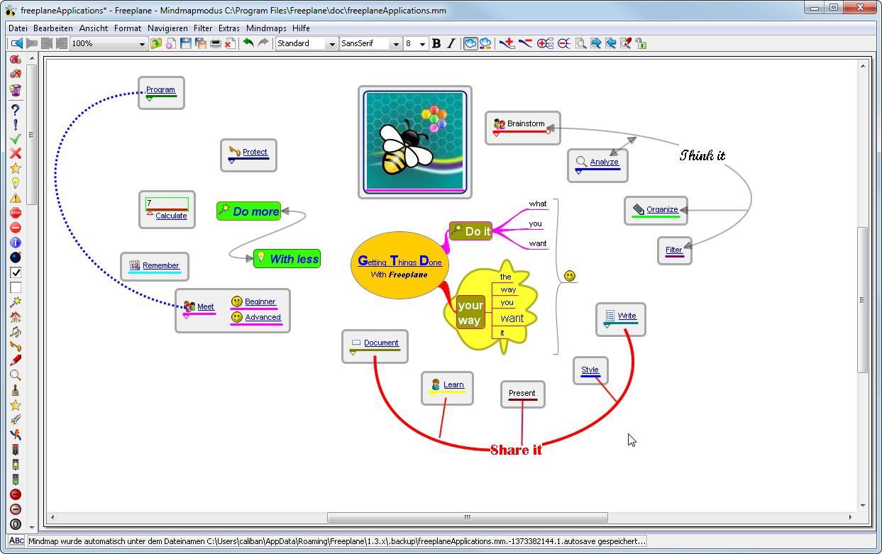 Freeplane ofrece una forma intuitiva de organizar el contenido para darle una ventaja . Este software organiza automáticamente la posición de los nodos, párrafos y encabezados de tu mapa conceptual. Además, puede establecer fechas de vencimiento y recordatorios para aumentar la productividad y finalizar las tareas a tiempo utilizando su función Calendario de tareas y recordatorios.