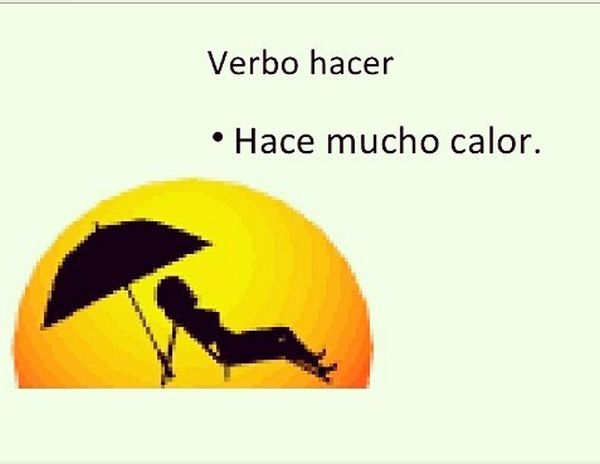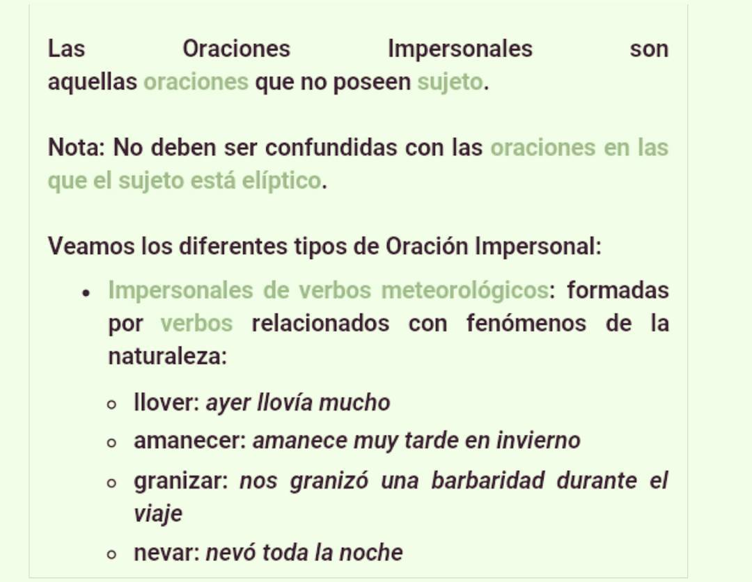 - Meteorológicos: son aquellas frases donde se encuentran incluidas palabras en referencia condiciones climáticas, con verbos como granizar, nevar, llover, nublarse, amanecer o tronar. Como ejemplo: está amaneciendo más tarde de lo debido, lloverá mucho en la mañana.
